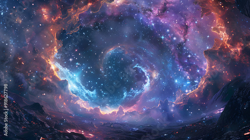 The watermark will not be included on Wall mural.: A space scene with a large hole in the ground and a river flowing through it