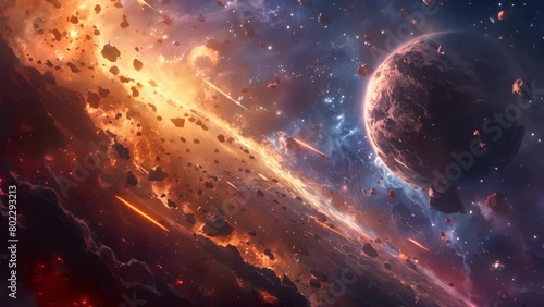 Wall mural a space scene with a planet and a lot of rocks. the planet is in the middle of the scene and the roc