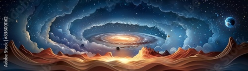 The watermark will not be included on Wall mural.: A space scene with a spiral galaxy in the center and a planet in the background