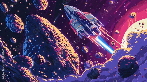 The watermark will not be included on Wall mural.: A spaceship blasts through an asteroid field in space -