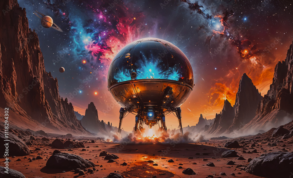 Wall mural a spaceship is floating in space with a large mirror on the front. the background is a colorful, roc - Wall murals Wall mural a spaceship is floating in space with a large mirror on the front. the background is a colorful, roc - Wall murals