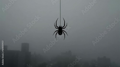 Wall mural a spider hangs from a thread against a foggy background with buildings in the distance view scene