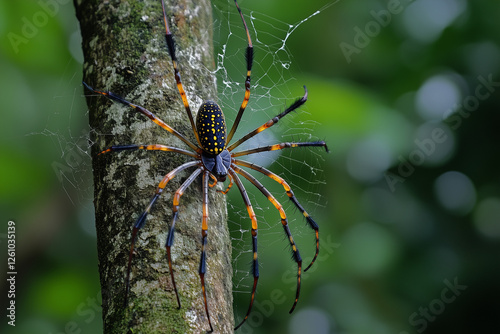 The watermark will not be included on Wall mural.: A spider weaving web on a tree in forest -