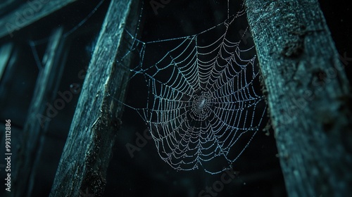 Wall mural a spider web clings to the side of a wooden structure in a dark forest, adorned with water droplets - Wall murals Wall mural a spider web clings to the side of a wooden structure in a dark forest, adorned with water droplets - Wall murals