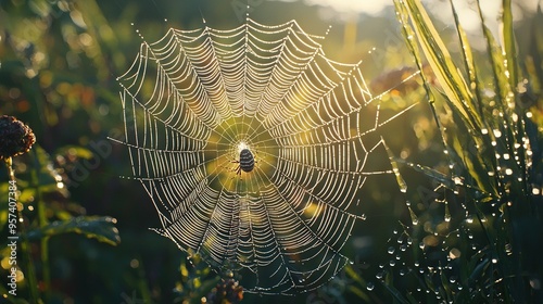 The watermark will not be included on Wall mural.: A spider web with dew drops and a bee in its center, resting in a field