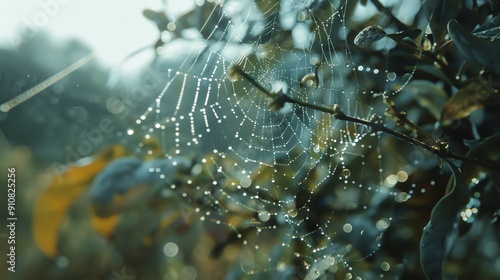 The watermark will not be included on Wall mural.: A spider web with dewdrops on it -