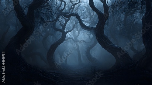 The watermark will not be included on Wall mural.: A spooky atmosphere with hidden creatures and twisted trees in a dark forest