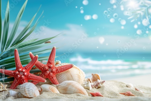 The watermark will not be included on Wall mural.: A starfish and seashells on the beach with palm leaves, sunlight shining through - generative ai