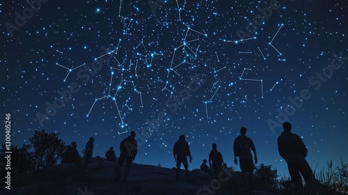 The watermark will not be included on Wall mural.: A stargazing scene on a hilltop, where a group of people are looking up at the dazzling display of s