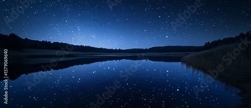 Wall mural a starry night sky is flawlessly reflected in a calm lake, creating a captivating mirror effect that - Wall murals Wall mural a starry night sky is flawlessly reflected in a calm lake, creating a captivating mirror effect that - Wall murals