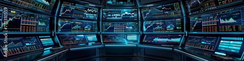 Wall mural : A stock market setup with multiple monitors displaying realtime business data and graphs, showcasing