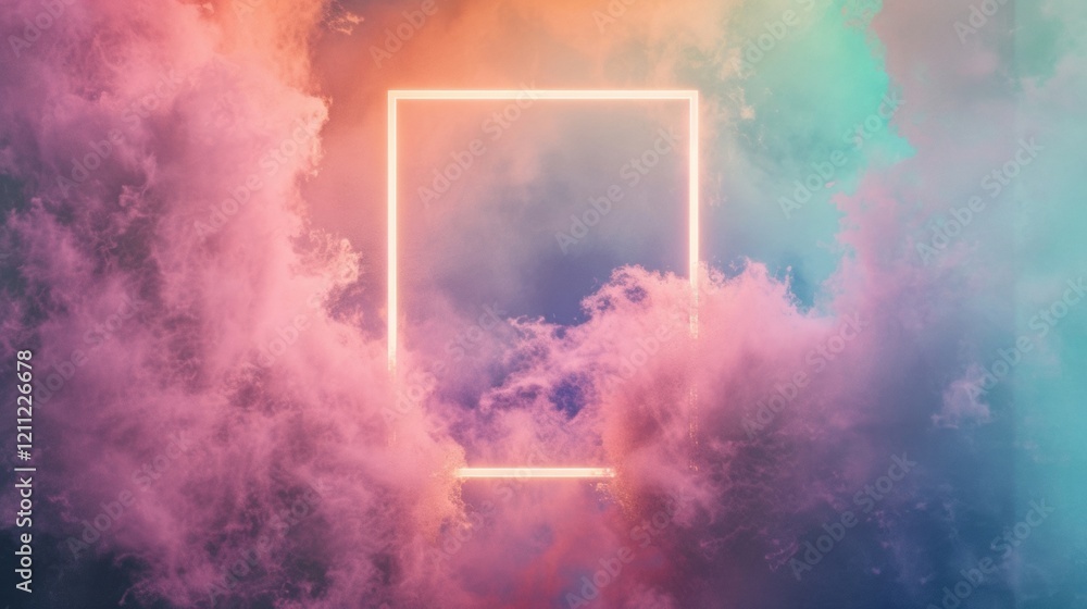 The watermark will not be included on Wall mural.: A striking neon square floats amidst colorful clouds, creating a surreal and captivating visual expe