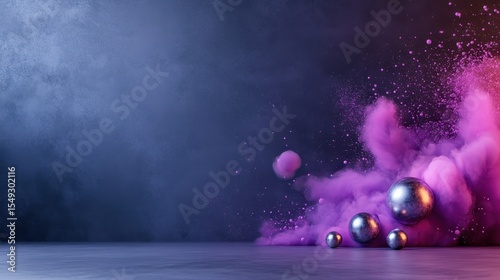 Wall mural a striking visual of metallic spheres surrounded by colorful smoke, creating an abstract and dynamic - Wall murals Wall mural a striking visual of metallic spheres surrounded by colorful smoke, creating an abstract and dynamic - Wall murals