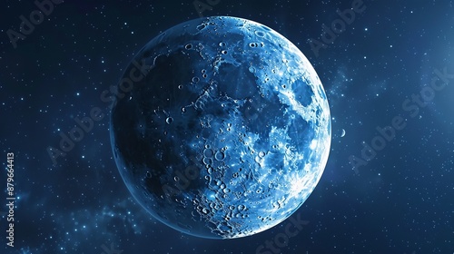 The watermark will not be included on Wall mural.: A strikingly luminous blue moon with visible craters, set against a starry night sky, creating a cap