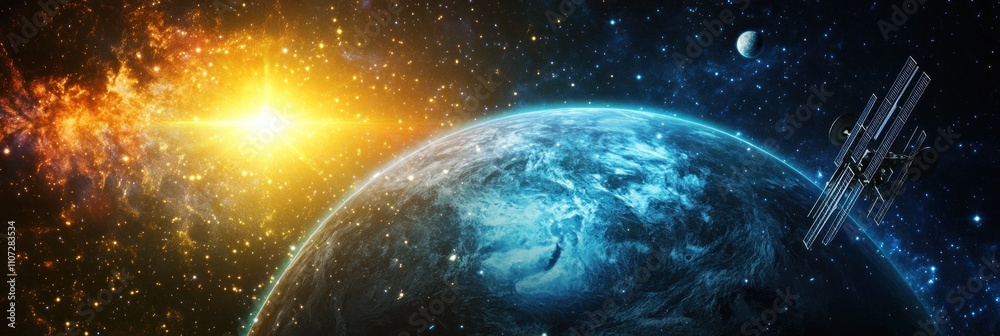 Wall mural a stunning cosmic scene featuring earth, a distant planet, and the international space station. - Wall murals Wall mural a stunning cosmic scene featuring earth, a distant planet, and the international space station. - Wall murals