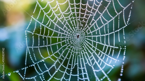 The watermark will not be included on Wall mural.: A stunning macro shot of morning dew on a delicate spider web, with intricate patterns and a soft bl