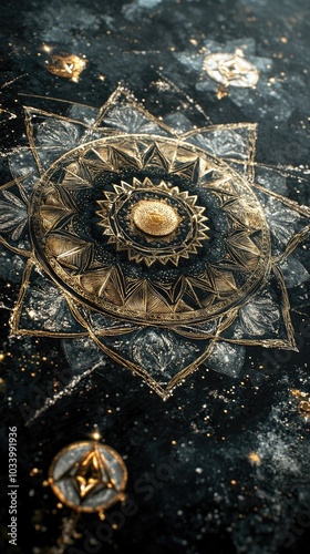 Wall mural a stunning mandala design featuring intricate patterns and golden details, set against a dark, cosmi