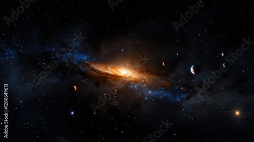 Wall mural a stunning swirl of colors fills the cosmos, featuring a luminous galaxy surrounded by several plane