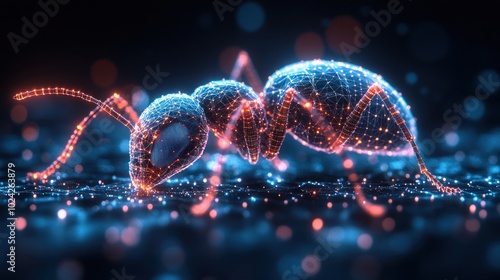 Wall mural a stylized digital rendering of an ant, rendered in a glowing wireframe style with red and blue ligh