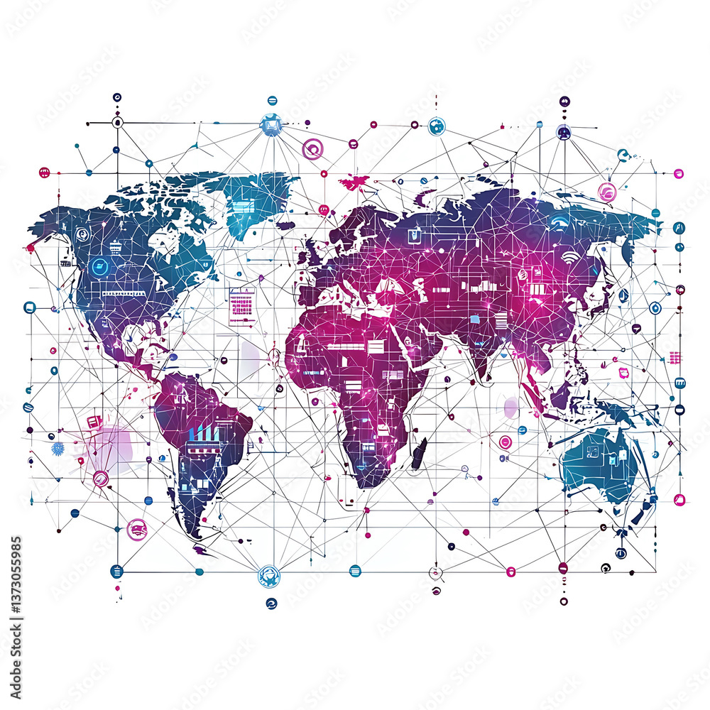 The watermark will not be included on Wall mural.: A stylized world map overlaid with a network of interconnected nodes and data visualizations symboli
