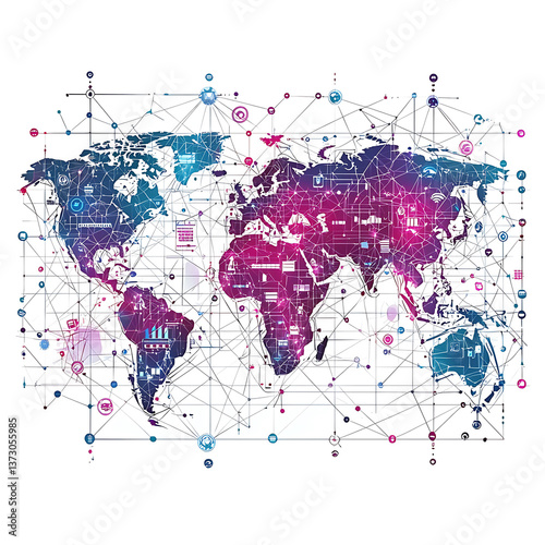 Wall mural a stylized world map overlaid with a network of interconnected nodes and data visualizations symboli