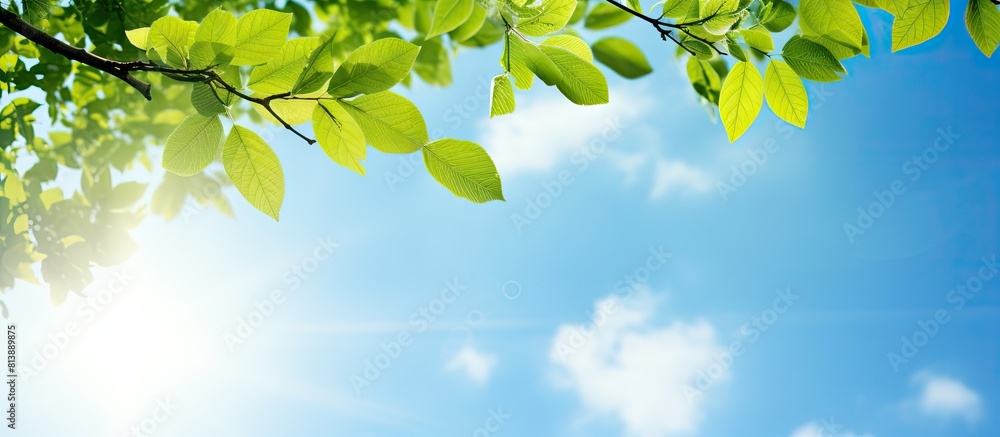 Wall mural a sunny blue sky serves as the backdrop for a tree branch adorned with green leaves creating a summe