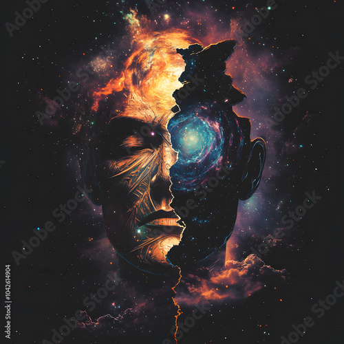 Wall mural a surreal cosmic mask of a god split in two, revealing a swirling galaxy inside. the mask represents