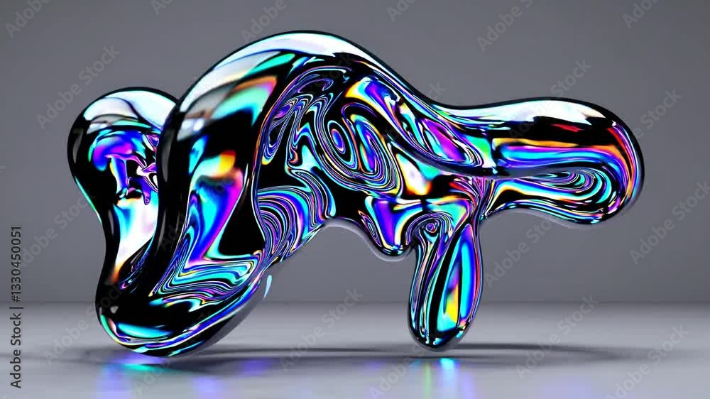 The watermark will not be included on Wall mural.: A surreal iridescent liquid metallic abstract shape with smooth reflective surfaces and a gradient o