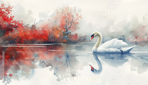 Wall mural a swan is swimming in a pond with orange leaves floating on the surface - Wall murals Wall mural a swan is swimming in a pond with orange leaves floating on the surface - Wall murals