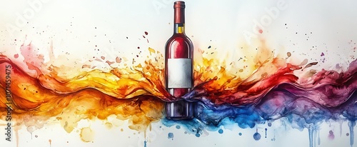 The watermark will not be included on Wall mural.: A swirling spectrum of rainbow colors flows from a rich red wine bottle blending into an abstract wa