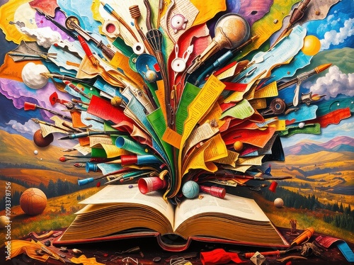 Wall mural a symbolic book unfolds into a surreal landscape. its pages transform into trees paths and stars sym - Wall murals Wall mural a symbolic book unfolds into a surreal landscape. its pages transform into trees paths and stars sym - Wall murals