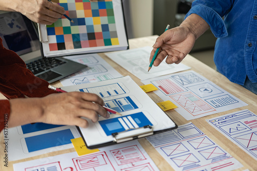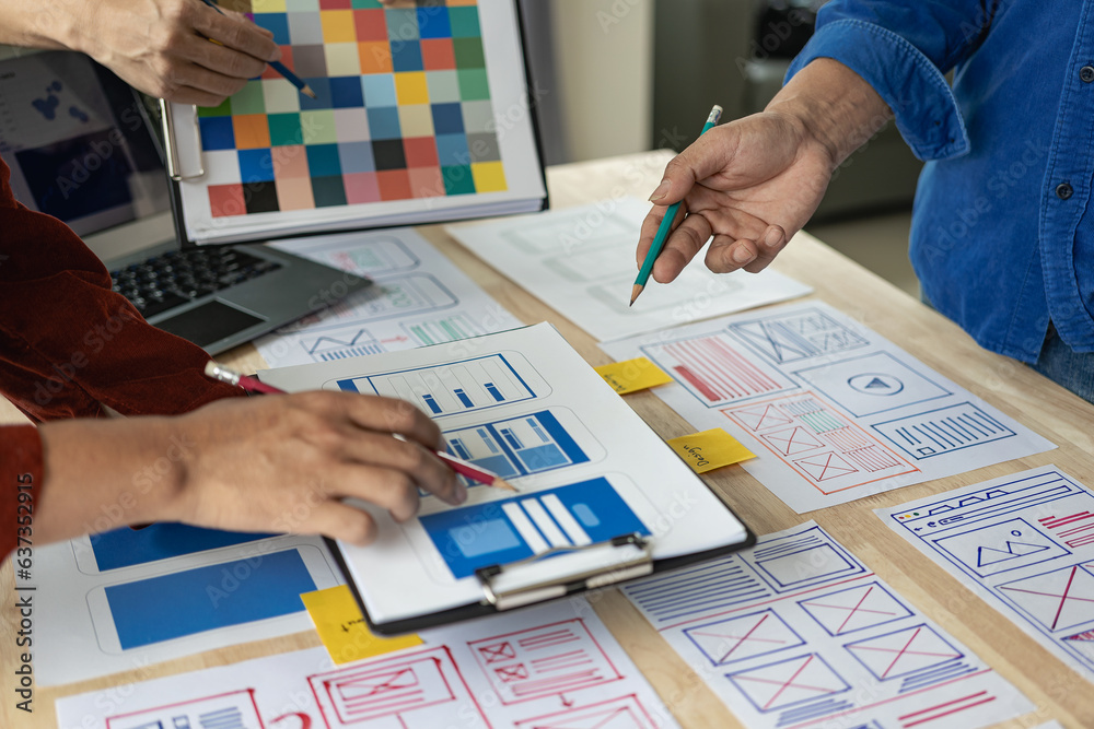 Wall mural : A team of web designers are working together to develop a mobile responsive website with ui/ux front
