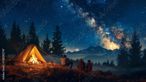 The watermark will not be included on Wall mural.: A tent is set up in a field with a beautiful view of the mountains and a starry sky -