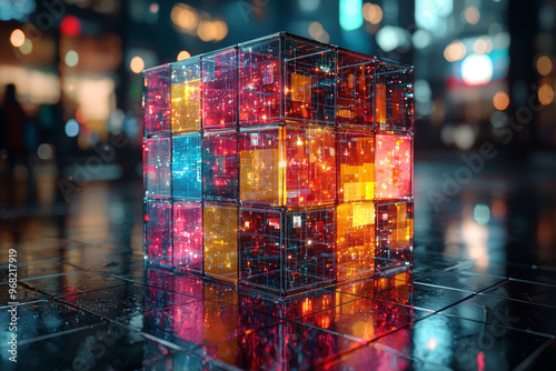 Wall mural a three-dimensional cube with each face labeled and colored differently, illustrating the properties