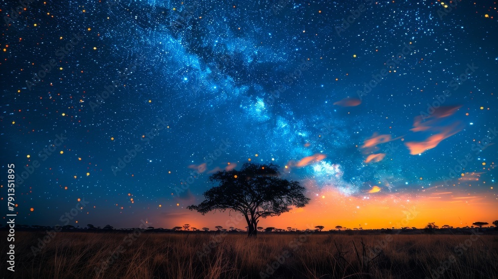 The watermark will not be included on Wall mural.: A tree is lit up with lights in the middle of a field at night
