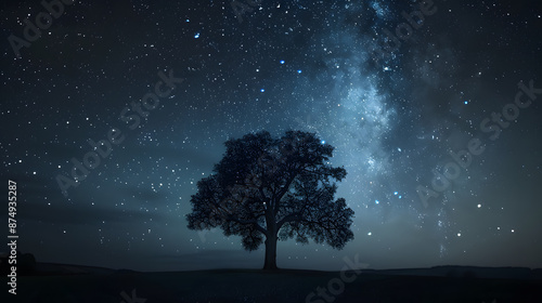 The watermark will not be included on Wall mural.: A tree is standing in a field of grass under a starry sky