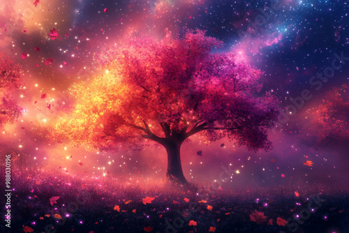 The watermark will not be included on Wall mural.: A tree with leaves of different colors is in a field of grass