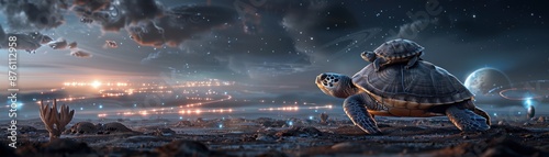 Wall mural a turtle is walking on a rocky surface with a bright light in the background - Wall murals Wall mural a turtle is walking on a rocky surface with a bright light in the background - Wall murals