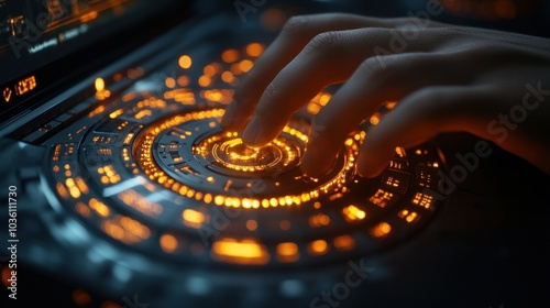 Wall mural : A user delicately engages with a high-tech interface, surrounded by an array of glowing orange light