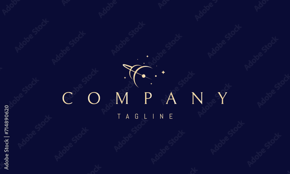Wall mural : A vector golden logo with an abstract image of two planets with an orbit against a background of sta