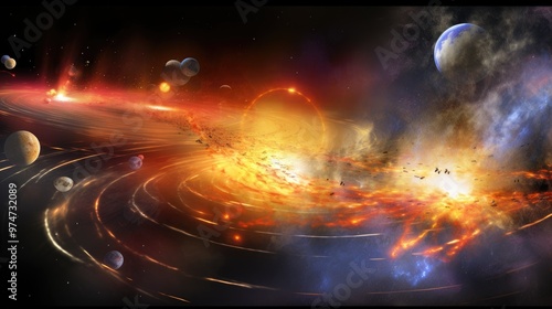 Wall mural a vibrant and dramatic depiction of a celestial collision, with planets and stars colliding in a fie - Wall murals Wall mural a vibrant and dramatic depiction of a celestial collision, with planets and stars colliding in a fie - Wall murals