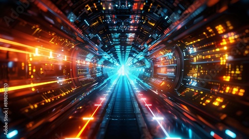 Wall mural a vibrant and futuristic tunnel illuminated with glowing lights, creating a dynamic sense of motion