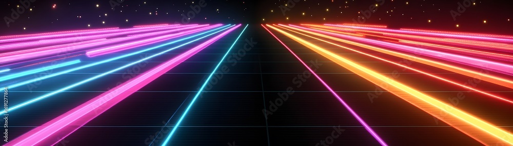 Wall mural : A vibrant array of neon lines converge on a dark, gridded surface, creating a dynamic and futuristic