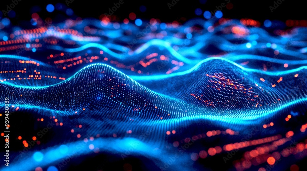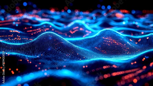 Wall mural a vibrant blue and red wave of digital data flows across the image. this abstract design captures th