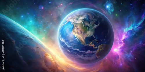 The watermark will not be included on Wall mural.: A vibrant celestial sphere with a planet and nebulae displaying a cosmic dance of light and color