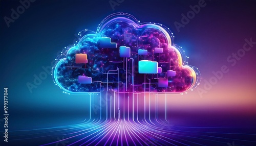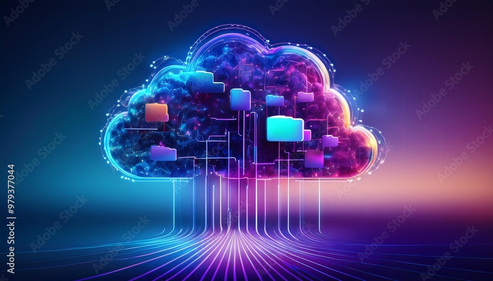 Wall mural : A vibrant cloud computing illustration with interconnected devices and data flowing around it -