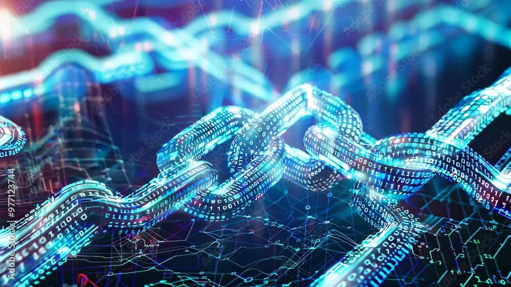 Wall mural a vibrant depiction of blockchain technology, featuring illuminated chains and flowing binary code,
