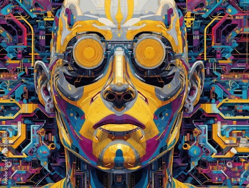 A vibrant digital artwork of a futuristic humanoid robot with intricate patterns and glowing orange Wall mural