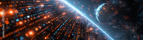Wall mural a vibrant digital landscape featuring a glowing planet and dynamic light patterns in deep space, per