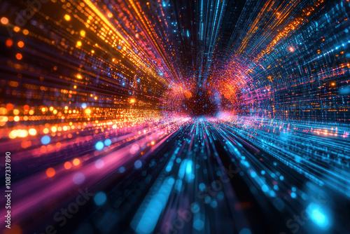 Wall mural : A vibrant explosion of colorful light particles creating a dynamic energy tunnel, symbolizing techno
